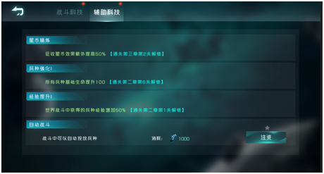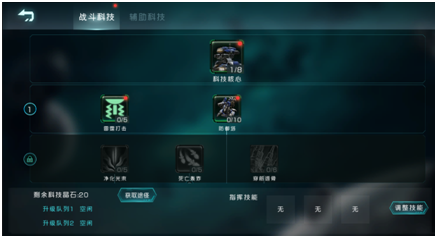 玩家可以在科技建筑内通过消耗科技晶石与时间来研发与升级战斗科技,部分战斗科技可以在战斗中作为指挥技能使用,部分科技则是以buff加成的形式对战斗中的部队起到加成效果