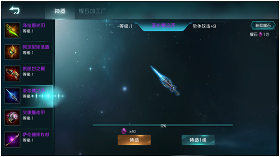 神器可通过消耗稀有资源“耀石”进行升级,提升神器的加成属性