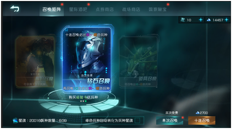 星际酒吧内消耗钻石或星魂购买兵种碎片合成
