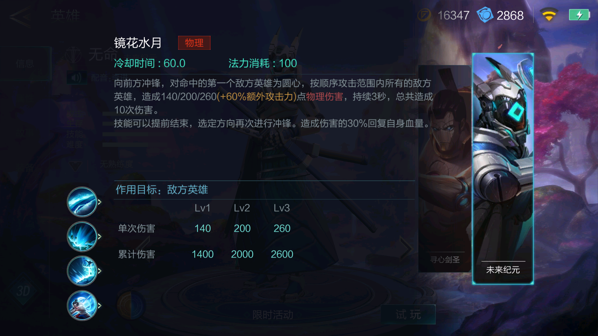 中路的无命基本都是塔下苟活吃经验,毕竟前期对上法师,无命还真是没什么办法,然而一旦到4级,1技能过去A一下一个2技能对面就已经掉了快五分之一的血了,多耗几次一个3技能直接收掉也是ok的。