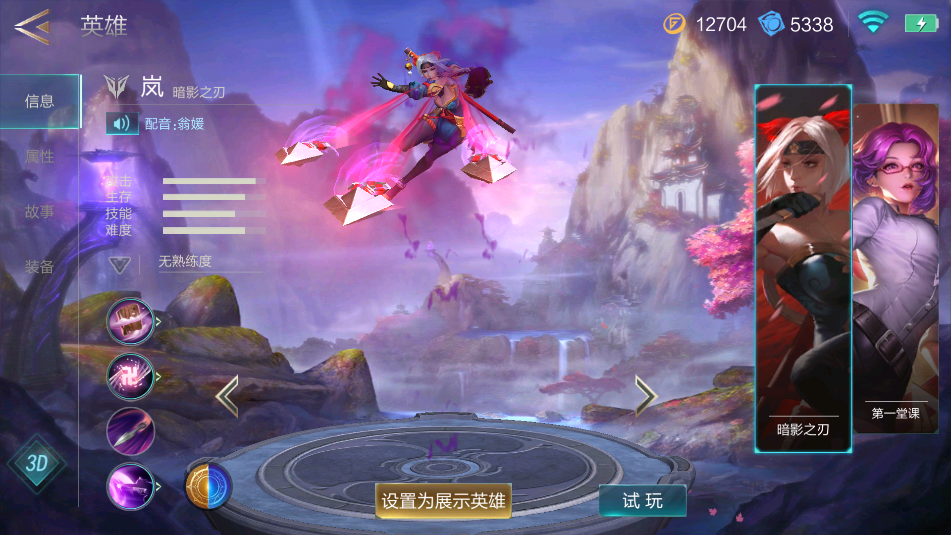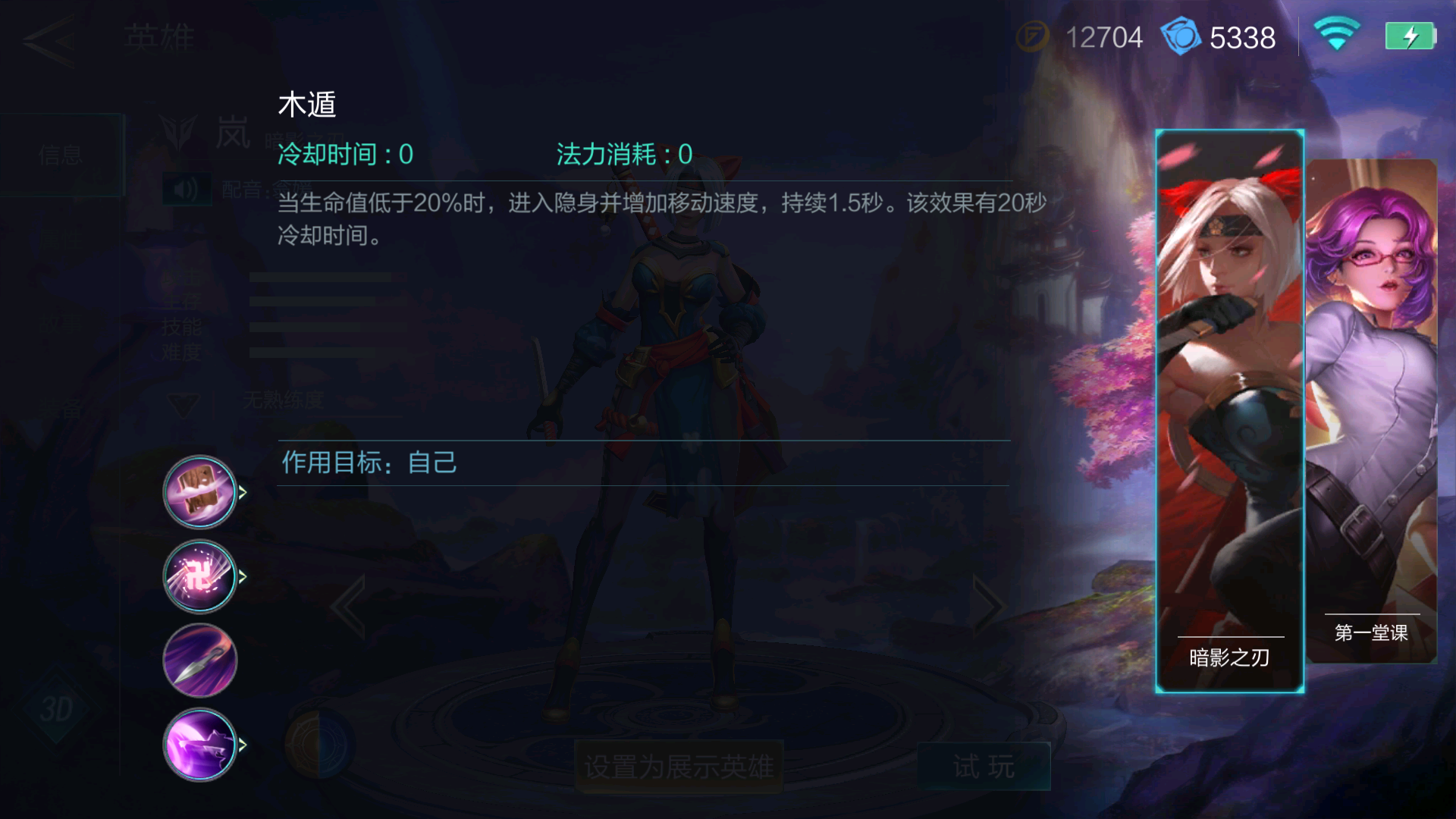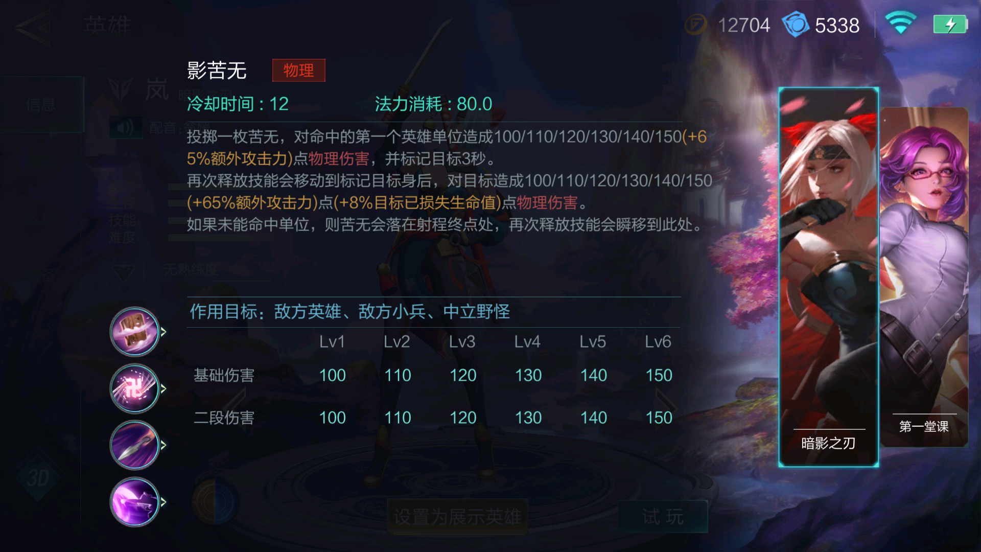 向选择的方向丢出苦无,命中英雄可以造成最多150基础物理伤害并标记对方3秒,而后可以再次激活技能,直接移动到目标身后造成最多150基础物理伤害并附加百分之8目标已损失生命值的物理伤害。