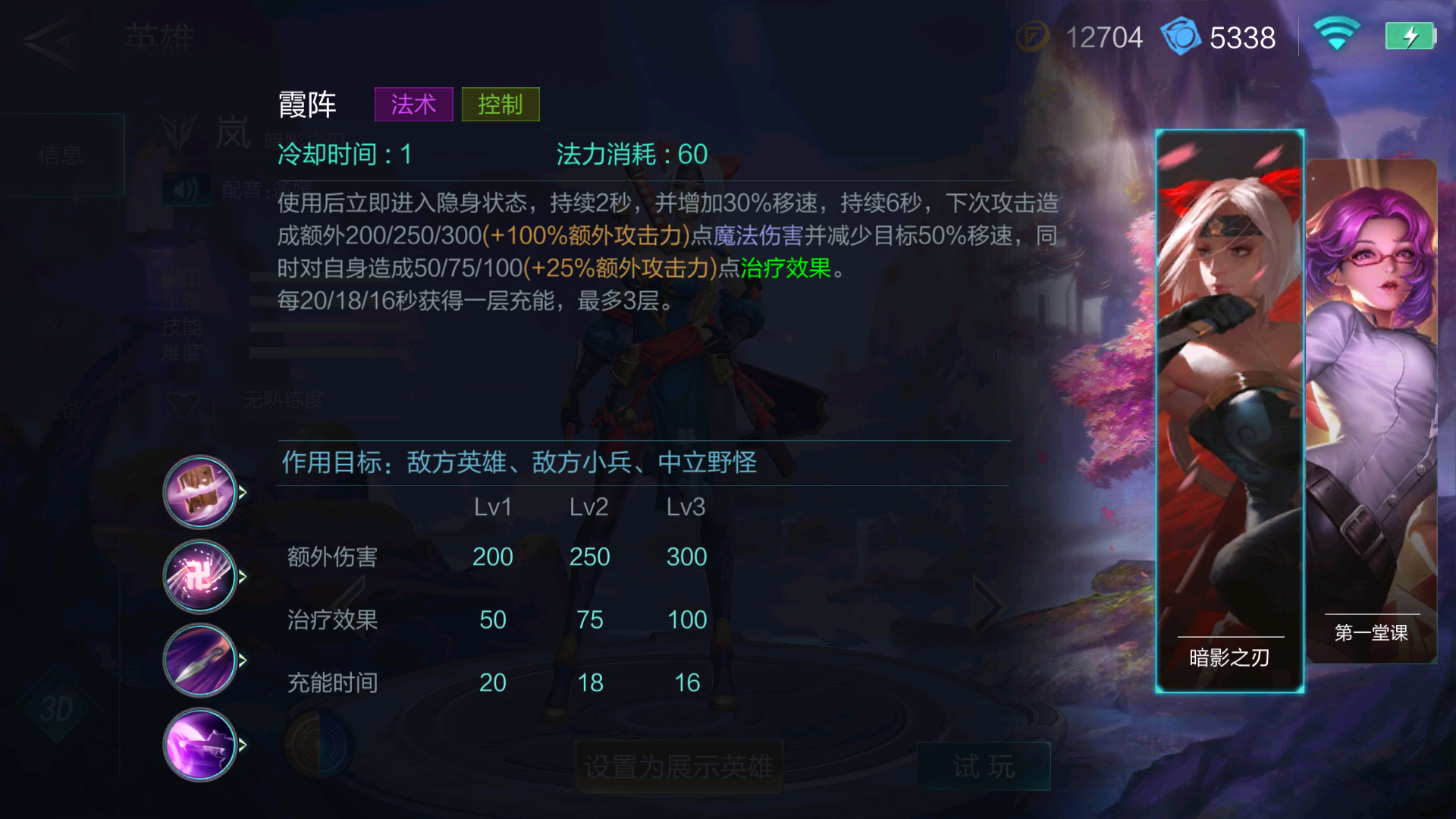 这个技能就是岚被称作暗影之刃的由来了,使用后直接隐身,持续2秒并增加自身百分之30移动速度,移速增加6秒,下次攻击造成额外最低200最高300外加百分之百额外攻击力的数值的魔法伤害,并减少对方百分之50移速,同时治疗自身最低50最高100 百分之25额外攻击力数值的回血。