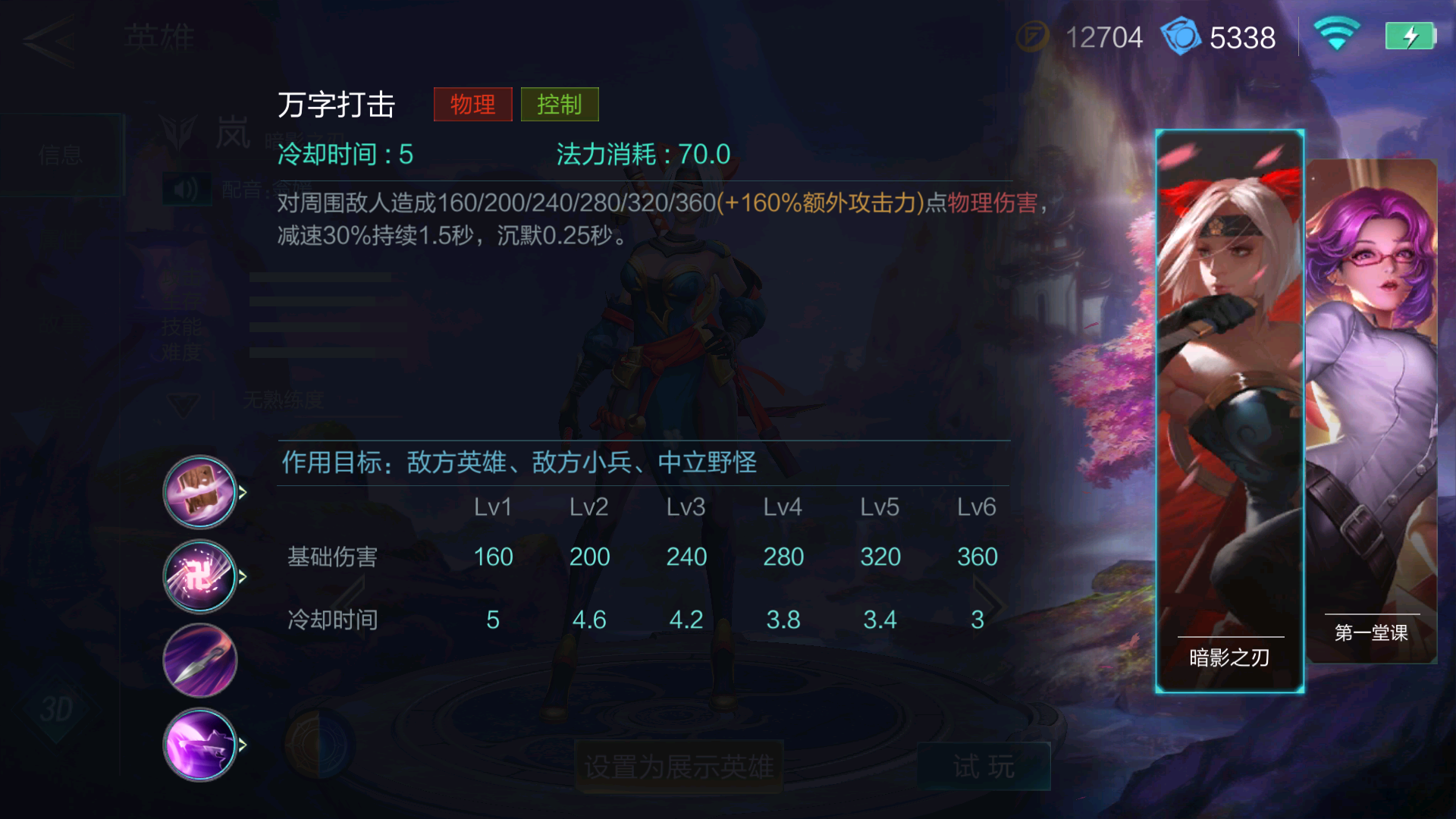 万字打击的攻击范围有岚的整个攻击距离那么大,并且造成的伤害也非常不多,可以说是岚的核心爆发力技能,并且技能自带百分之30的减速持续1.5秒,让岚能够追着别人打,并且还有0.25秒的沉默,不仅可以打断对面的技能,关键时刻也能够防止对面闪现逃跑,而这0.25秒的时间已经足够在敌方的身上打下影苦无了。