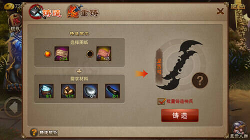 在新版的兵械库中,游戏还将开放更为高级的兵械库地图(龙渊兵械库、龙渊宝库),玩家需要角色达到102级以上才能够进入挑战。在铸造大师处,也可以使用批量铸造的功能,从而将保留有用的神兵,其余皆可直接一键分解。