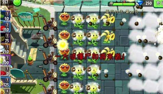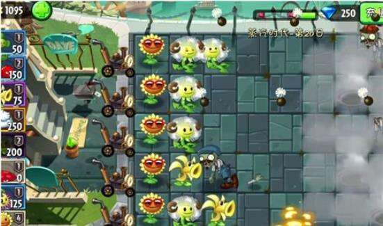 植物布阵:照例种植一列向日葵,收集阳光种植蒲公英炸弹绒球,再种植吹风荚兰,三叶草和冰龙草也别忘了种。