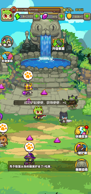 4:铲屎,猫窝中的伙伴不定时会产生便便,收集自己或好友猫窝的便便,可在铲屎官处兑换奖励