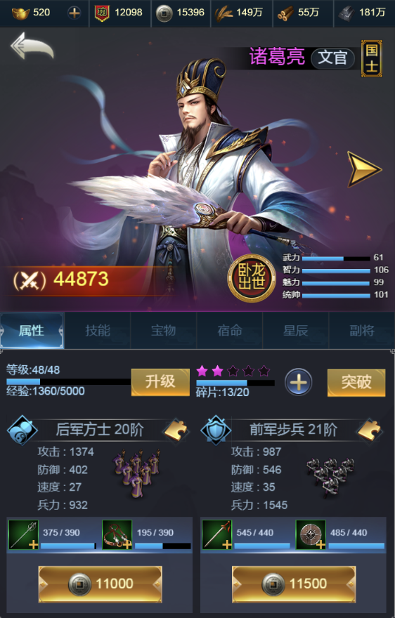 每个英雄都有自己的前后军组合,不论他的前后军组合是什么,如果使用军械碎片来培养的话,都能变成以一当十的精兵强将。