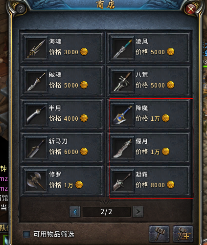 首先,一路直奔武器店(比奇盟重都有),点击漂亮的商人MM,选择一把合适你当前等级的武器。介于开服两周多,大部分玩家都和小编一样20多级,那么建议大家购买第二页的降魔、偃月或凝霜。