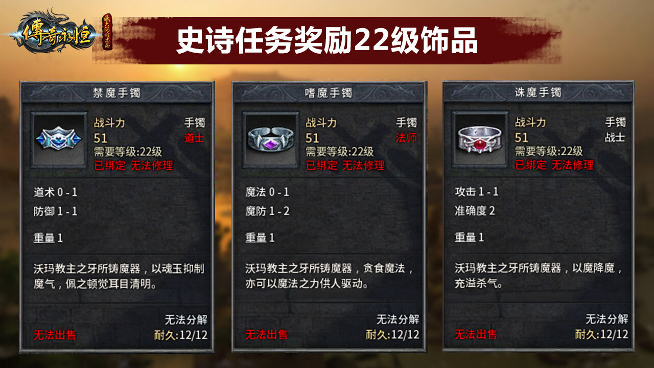 一句话点评:24级在沃玛寺庙领取到的史诗任务,收集BOSS沃玛教主掉落的沃玛教主之牙。奖励22级饰品,属性略好于商店货。由于击杀沃玛教主需要一定实力,强烈建议大家组队前往挑战。