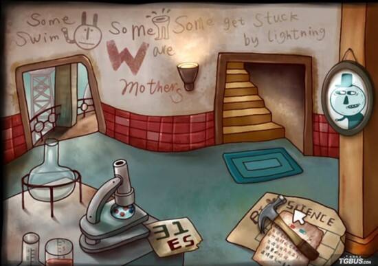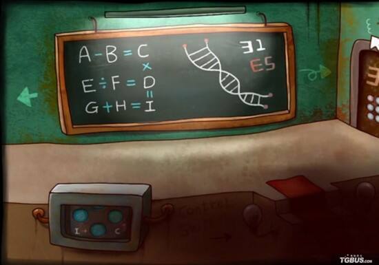 8.回到刚才黑板的地方,点击下方墙上的机关。上面需要AFCI四个数字,根据黑板上的公式我们推出来A=9.F=3.C=4.I=8.解开机关后下面楼梯的灯就亮了。