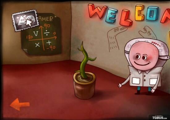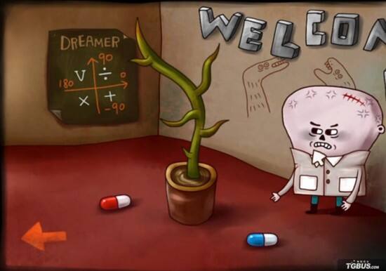 10.在右边的墙上,看见了那张机器人想要的照片。先将照片收起来,然后和右边的人对话。原来他想要药水,我们将药水给他后,他浇在了面前的盆栽上。 盆栽受到了不知名的药水滋润,疯狂生长还结出了花。我们将花拿走后,音乐气氛就开始变了。而右边的人也摘下了面具,原来他就是白博士。
