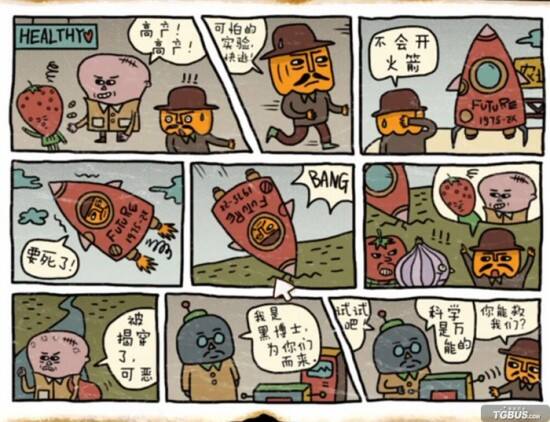 16.将瓶子给白博士,白博士再次倒在盆栽上。盆栽再次发疯似的长起来,来到上面后发现南瓜先生被枝条顶到外面去了。他呆在一座火箭里,准备逃离这里,但是好像无法启动。我们将手中剩下的花放入火箭外伸的管子中,火箭就启动了。