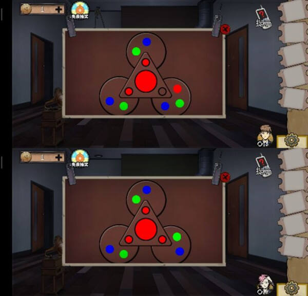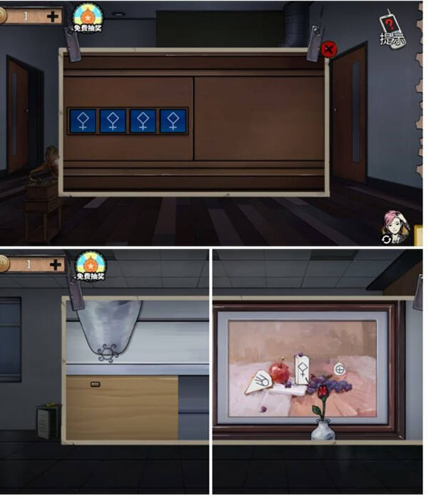 25、可以尝试破解这个,在留声机的抽屉(男),密码应该是画上的,记得按顺序,花花是第三位得到滑轮就和绳子组合然后去搬花盆。