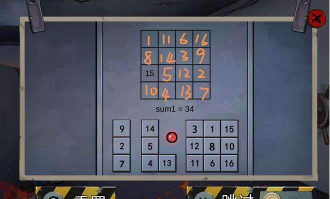 (纸片提示 竖列横列和斜列总和相同为34 )得到(电池)男警回到洗衣房 用火钳子夹出暖气片里的(圆形卡片)3楼走廊捡到女警扔过来的电池 组合得到(机器)放上透明卡片 通过小游戏9