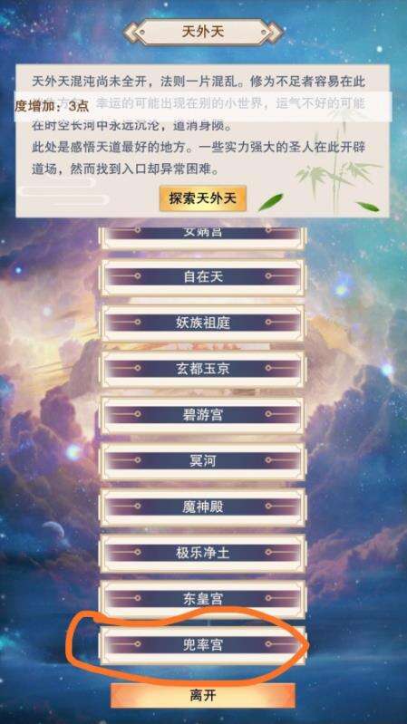 首先通关魔界小世界之后,点击天外天,天外天每天都可以探索出一个来,最后一个就是兜率宫。