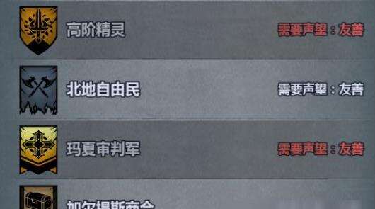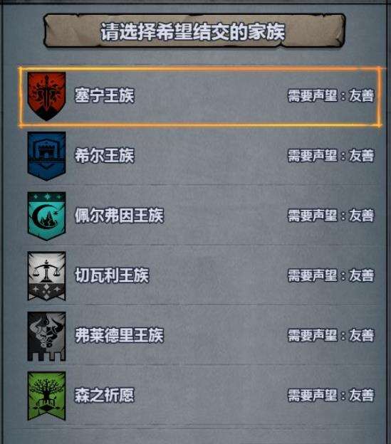 这是目前已知全部可以结婚的派系,不过都需要对应的声望才行,最低为友善,骑士,最高为尊敬公爵,公爵以下信赖即可。