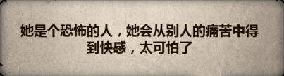 这代表了她的一个特性,从这个话里面可以看出俩种可能,第一种是残忍,残忍特性暴击+7%,另一种肯能是暴力倾向+3攻击力 不过第一种残忍可以高达80% 因为我记得暴力倾向有过单独介绍,嗜血也不一样,不过没有太大差别,注意这不是受虐,他喜欢从别人的痛苦中找快感。不过以上只是为了介绍他这个对话的信息作为分析参考。