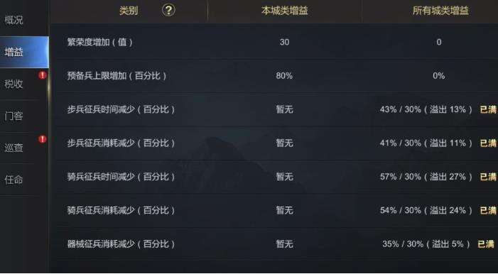 增益:分为本地等级增益和所有城市等级增益。一些增益效果有上限,溢出不计算在内。