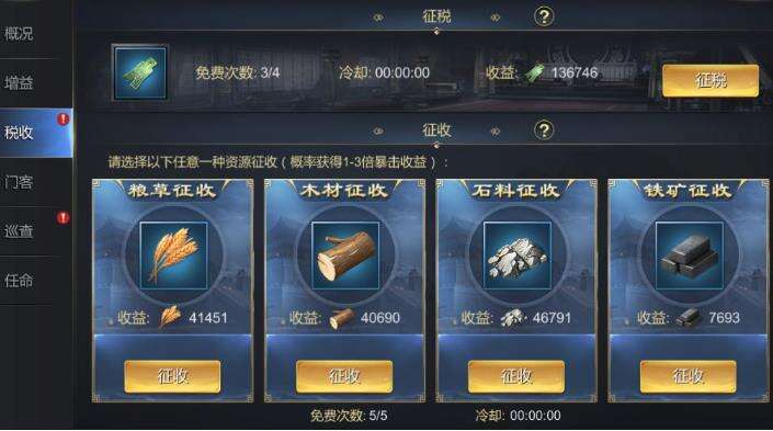 税收:可以征收五种资源,包括四次刀币征收,五次普通征收四种基本资源。每次征收都有一个小时的冷却时间,在再次征收之前需要加速到0。如果普通征收进行五次,将被强征代替,强征的次数将固定为每天五次。在强征期间,您也可以使用元宝来加速资源的直接获取,但是使用的元宝是双重消耗,并且声誉将被扣除。