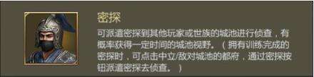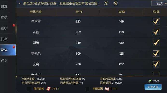 巡查:武将的巡查可以提高城市的治安值。每支巡查队最多可以选择5名,巡查队消耗大量的刀币。提高的治安值依据所巡查的武将所决定,巡查武将的武力值越高则所获取的越高,反之亦然;巡查武将的谋略值越高,他们就越有可能找到叛军。在叛军被发现且杀死后,可以得到叛军掠夺的所有资源。
