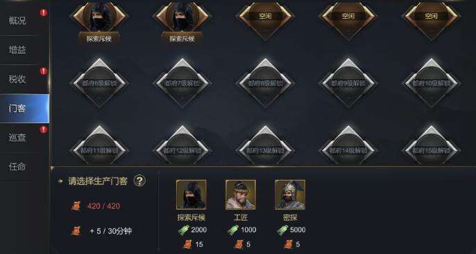 主君在最初招募的最大门客数量是5个,然后随着都府等级的提升,新的位置逐渐被解锁。每位君主最多可以有15位门客。门客的使用可以是所有城市共享的。