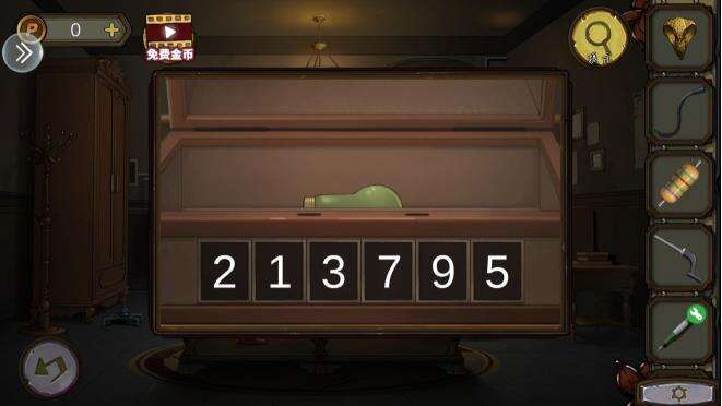 11.用目镜看左边墙上的画,可以得到另一个线索。因此,我们可以知道方块是2,三角形是3,得出大厅的纸上的密码,顺序为6536535165123,按顺序弹钢琴,得到棍子和润滑剂。