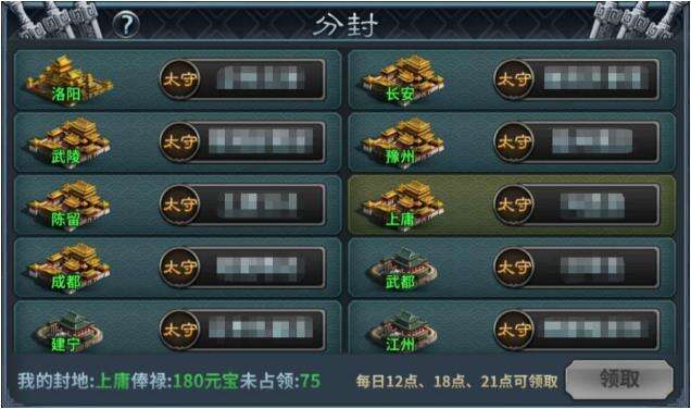 5.拥有封地的玩家可以根据封地获得太守的俸禄,没有被分配到封地的玩家只能获得30锭的分封奖励。