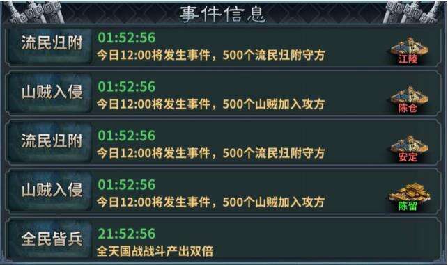 1.每天12: 00、18: 00和21: 00,都会有一个固定的预告事件,或者难民会加入某个城市,或者山贼会攻击某个城市,保卫山贼并杀死加入的难民,所有这些都可以获得一定的资源回报。