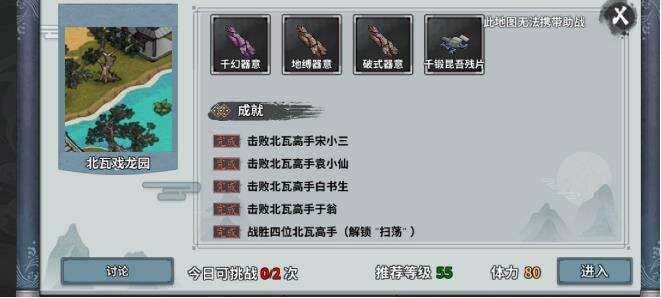 那些没说武学的,使用自带的武学足够了。如果资源不够,可以先集中打一个boss,赢了就退,然后集中资源,进副本再打另一个boss,每天两次,两天就能通关。