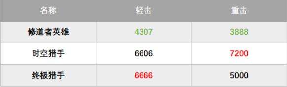 修道者英雄的重击速度,对比男猎手来说,打出时间从1.200s变为0.800s,是有很大的进步,但是收回速度又不如男猎手的速度了,总耗时虽然略小于男猎手,但是由于重击只有7000的威力,按照dps计算,是远不如男猎手(男猎手为5000dps),修道者英雄重击为3888dps。同时,重击范围距离都远不如男猎手,在实战中很容易打空。