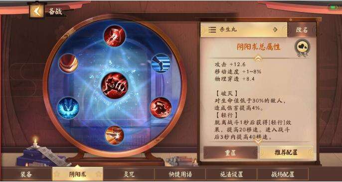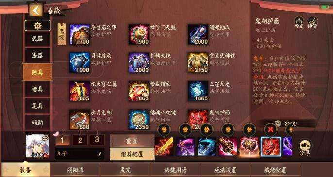 【鬼相护面】血量低于一定百分比会提供大盾和攻击加成,一定程度上可以避免杀生丸无故被动浪费。触发盾牌攻击加成和生命加成也是不错的选择。