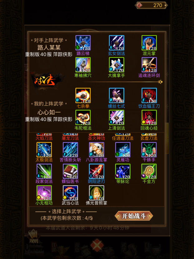 这是第一场比赛。很多时候,会是这种福利局。因为对方在武学有空缺,所以白武都可以赢。然后我们会提前消费一些不切实际或者毫无价值的武学,比如绿轻功之类的。因为玩家必须在第一轮先打,所以如果对方有一个武学例如杀气集气残废冰封之类的,但是如果你没有,他可以很轻松的从你身上赚一轮。他移动了两回。但如果你要移动两轮,一个绿轻功是做不到的,所以绿轻功一般价值为零。