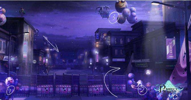 以上图为例,场景设定如下描述这一场景:笼罩在不安气氛中的午夜大街,随时都有可能发生奇怪的情况,结合关卡的主题增强了荒诞感。在实际的场景空间构建中,我们一方面通过调整灯光效果来增加朦胧和不安的感觉,另一方面通过在场景中放置特殊的装饰品来完成突出荒诞性的要求。