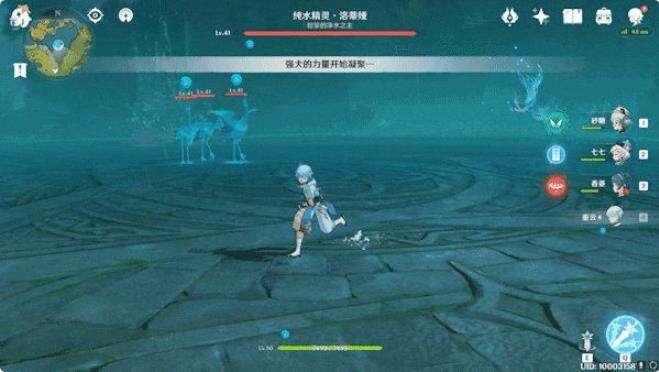 纯水精灵作为一个比较特殊的boss,其战斗基本都是与上述的水之幻形进行,由于水之幻形自身为水属性,所以身上会持续附着水元素,我们可以利用这点使用冰元素的角色对其造成冰冻效果后进行输出或者直接用雷属性角色造成长时间感电伤害进行范围输出。