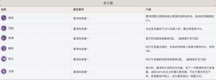 使用技巧:雷泽的元素爆发优点在于元素战技和天赋能够提升元素充能效率以及元素战技能够回复能量,因此能够以较快的速度充能,而劣势是由于召唤的雷狼在切换角色后会消失的缘故,该技能无法进行速切打法,需要一段时间战场的站场输出。因此在大招开启期间需要其他长时间能够提供元素附着的角色配合从而达到大招期间反复触发元素反应的效果。例如: