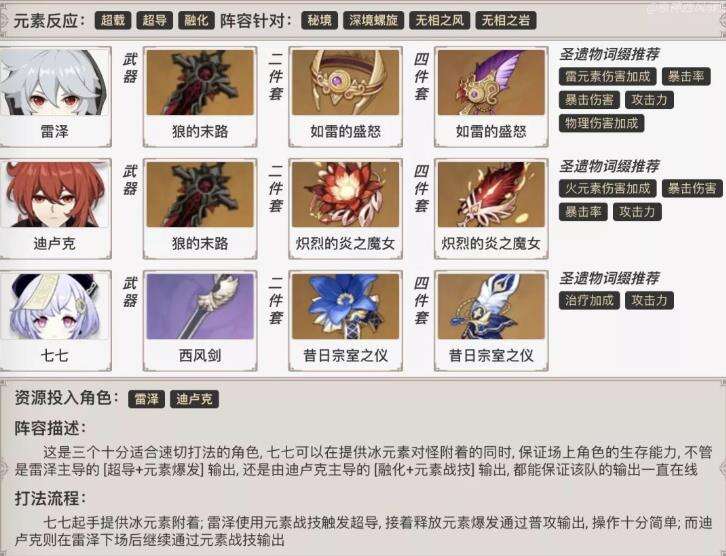 该阵容是以雷泽与迪卢克作为元素主输出的阵容,队伍主要资源集中在雷泽或迪卢克。队伍中第四位角色建议选择火元素/冰元素角色,通过激活元素共鸣为队伍带来增益。