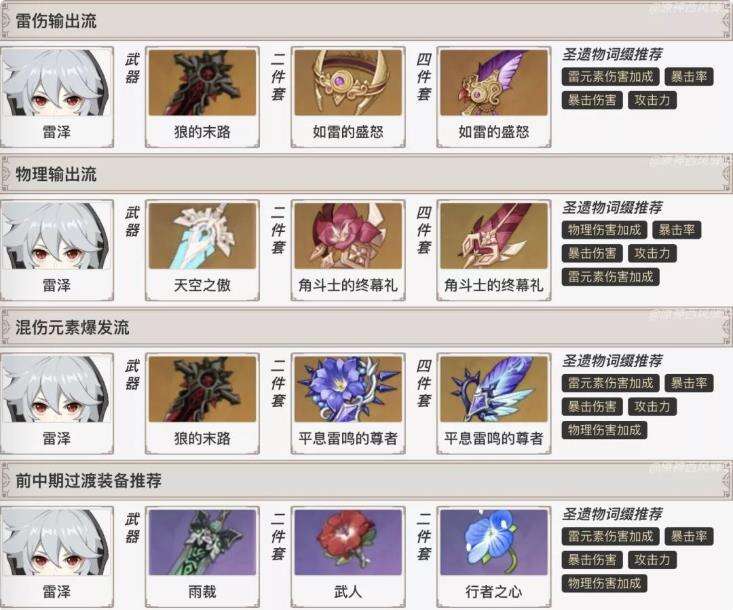 如果没有七七的玩家,可以考虑在队伍中配搭低练度凯亚(无须投入太多资源)以元素充能效率为核心,通过频繁开启元素爆发一样能达到辅助的效果。这里不推荐重云作为冰元素辅助,重云的元素附魔机制会覆盖雷泽原本的物理伤害属性,导致无法获得超导的40%物理抗性削弱效果。因此「雷泽 x 重云」相性极差。