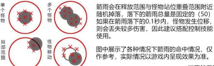 射出火元素伤害的箭雨(共50发箭矢)在短时间内对范围内的敌人进行攻击(通常情况下无法打满伤害);为了尽可能打满伤害,需要在释放元素爆发前丢一个兔兔伯爵,或由其他角色丢一个控制技能、降低怪物的移动速度后切安柏释放元素爆发;箭雨掉落时间内,可以将其中怪物视为被火元素持续附着,配合其他角色的技能或爆发攻击可以打出各类元素反应。例如: