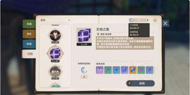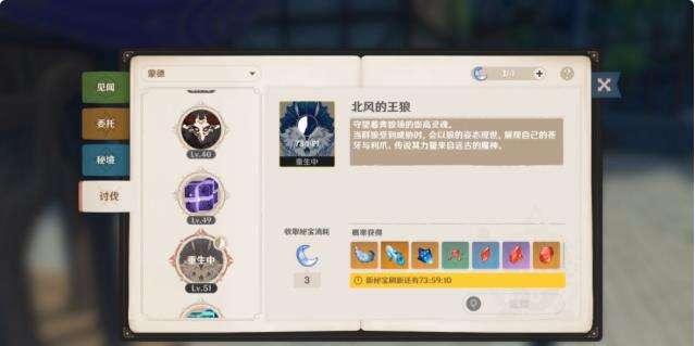 Boss讨伐是高级素材的主要来源,游戏的核心日常之一。收取BOSS掉落的秘宝时会消耗元素精魄。元素精魄每4小时恢复1点。无相元素的秘宝需要2点。风魔龙和北风狼的秘宝需要3点,且每周只能开启一次。