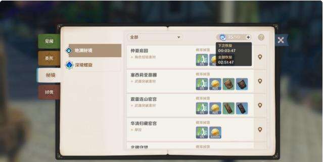 推荐理由:秘境资源收益极高且是冒险阅历的主要来源之一,推荐各位旅行者每日清空。但对于35级之前的玩家,不太推荐圣遗物副本,收益较低。建议优先提升队伍等级来解锁更高等级的副本使收益最大化。