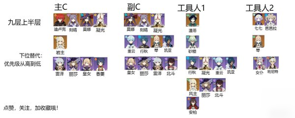 第9层第一间其实很简单,只要别靠近史莱姆就行,尽量走位拉着输出,不然....有你爽的,可能直接暴毙...第二间上半最好有聚怪角色,方便快速打怪,最后召唤蚊子的技能比较恶心,有个三角阵还有个蓄力落雷,三角阵不要碰到边缘,落雷可以离远也可以优先击破,这时候奶就显的很重要了.下半层最好在它们爆发前干掉,但会有些困难,小心风属性愚人众,被吸住有极大几率暴毙.第三间上半,注意捡土龙的结晶加盾,优先击杀土龙,和丘王一定要拉开距离,不然...不死也重伤,下半间就简单的很了,比如,有皇女的话,节省体力躲它俩的跳和导弹就行,其余时间就是射它俩要害,等它们蔫了,再爆发就好.
