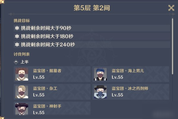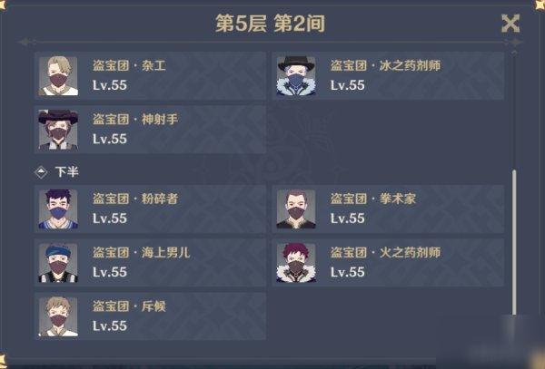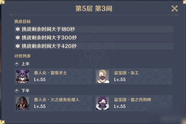 第五层说实话也不是很难,第一间的话,有聚怪角色聚怪打,这样会很快,没有聚怪角色的小伙伴要注意优先杀弓箭手哦,下半场的火法师记得用水属性快速击破护罩,击杀即可.第二间的怪,有很多都是那种你不来打我,我懒得追着打你那种的,有聚怪不多说,没有的尽量利用相应元素反应快速击杀远程,近战会追着你打的,都一起干掉是最好的.第3间怪我记得不是很多,记得留副C或者主C一个大招,等最后放大招快速击杀.自我感觉最后一间,都是没那么难得,怪多的第二间第一间才是最麻烦的.