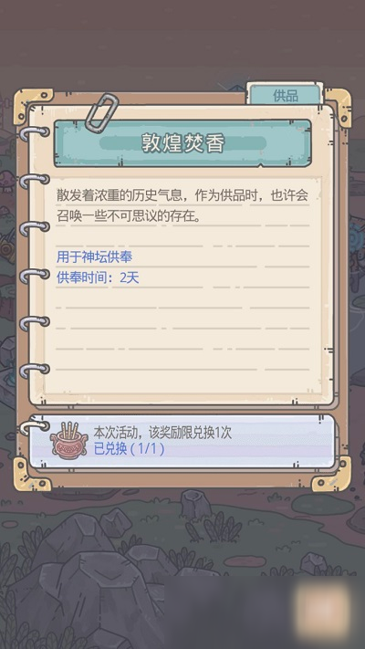 1、在10月9日5:00-10月16日4:59期间换取特殊活动祭品-敦煌焚香。(“水晶大作战”活动第一档奖励,花费500灵能水晶兑换获得)