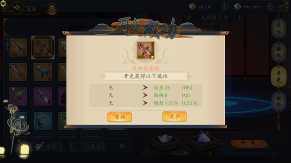 消耗天璇神砂可以为装备开光,并额外增加3条属性,开光属性不会重复。