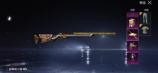 这是舞狮系列的M24枪皮,仍然具有浓浓的中国风,以黑金双色为主,枪托缠着红线,还有铜钱样式的纹路,看起来十分漂亮,和当初国服的"金玉无双"风格类似,整体非常雅观漂亮。