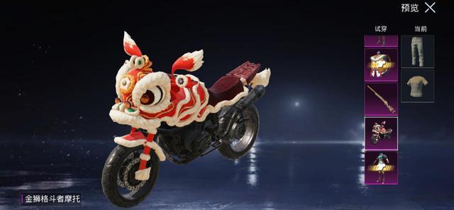 这是金狮系列的载具皮肤,以舞狮为主要元素,基本就是把舞狮套装盖在摩托车上,极具喜庆质感,至少算是优良级的载具皮肤。