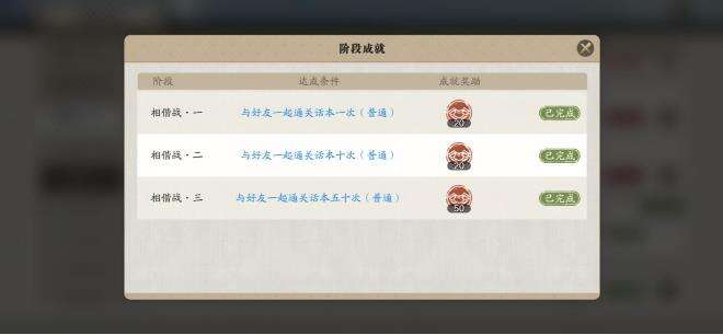 3.相偕战的系列成就位于成就体系“侠缘眷侣”的亲密社交部分。当你把它拉到最后,你就能找到这个成就。当你打开成就的时候,我们可以发现只有三个相偕战的任务,没有4号成就。要完成前三项,你需要和朋友通关话本1/10/50次。从每天2次的进度来看,需要很长时间来刷。