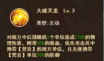 对本区后排两个随机单位造成170%物理伤害,30%吸血,优先攻击携带梵音的敌方单位,忽略携带梵音单位20%防御