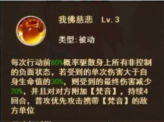 每次行动前,有80%的概率驱散所有无法控制的负面状态。如果单次伤害超过你生命值的30%,则最终伤害降低20%,[梵音]附在对手身上4回合。总攻击会优先攻击携带【梵音】的敌方单位