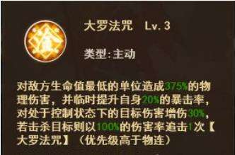 对生命值最低的敌方单位造成375%的物理伤害,暂时增加其20%的暴击率,并增加对被控制目标的30%伤害。如果你杀死目标,你将会以100的伤害率追一次【大罗法咒】(优先等级高于物连)